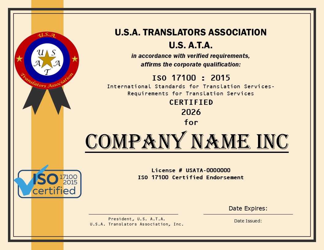 ISO 17100 Certification Checklist and Verification ; U.S. A.T.A. administered